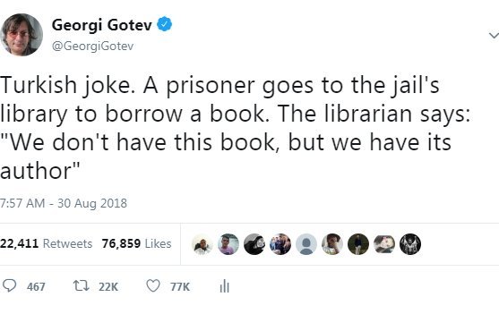 "Türk bir mahkum hapishane kütüphanesine kitap ödünç almaya gider. Kütüphaneci şöyle der: Sorduğunuz kitap elimizde yok ama yazarı var.."