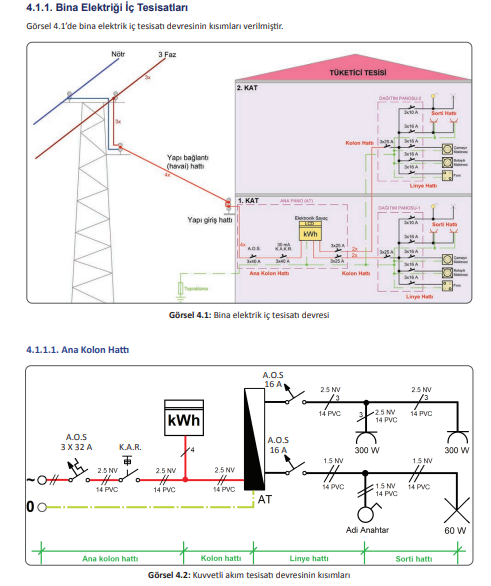 **ANA KOLON HATTI**İşletmeye ait besleme noktasından (ana buattan) tüketicinin ilk dağıtım noktasına kadar olan besleme hattına ANA KOLON HATTI denir. (Görsel 4.1) Bu hat, binaya enerji girişini sağlar (anapano). (Görsel 4.2)**Ana kolon hattının belli başlı özellikleri:*** Gerilim, binaya 3 x380 V şeklinde toprak hattı ile birlikte gelir.* 3 fazlı gerilim, bina için yapıya ve dairelere dengeli dağıtılır.* Binaya daire sayısı kadar sayaç bağlanır.* Binaya gelecek enerjinin yer altından mı yoksa havadan mı yapılacağı belirlenir.* Bu hatlarda kullanılacak kesit bakır ise en az 1 mm², alüminyum ise en az 10 mm² olur.* Gerekli görülürse binada kompanzasyon bağlantısı yapılır.---**KOLON HATTI**Tüketiciye ait ilk dağıtım noktasından (ana tablo, sayaç) öteki dağıtım noktalarına (tablolar) kadar oluşan hatlara kolon hattı denir. Bu hat, ana panodan diğer panolara enerji dağıtımının yapıldığı kısımdır. (Görsel 4.2)**Kolon hattının belli başlı özellikleri:*** Kolon hatlarında kullanılacak bakır iletkenlerin kesiti en az 4 mm² olur.* Kolon hattı, kısa devre kesme kapasitesi en az 10 kA olan devre kesicilerle korunur.* 3 fazlı gerilim, dairelere dengeli olarak dağıtılır. Fazlardan birinin fazla dağıtılması durumunda o faza ciddi oranda yüklenileceğinden fazlar arası dengesizlik oluşur.* Zil, kapı otomatiği, merdiven aydınlatması ve ortak kullanım alanlarının beslemeleri ise ana panodan dağıtılır.* İkincil (tali) dağıtım tablolarında kullanılacak anahtarlar, tercihen pako şalter olmalıdır.* Kolon hatlarında ek yapılmamalı ve dirsekler kullanılmamalıdır.---**LİNYE HATTI**Dağıtım tablosundan son aydınlatma armatürünün ya da prizin bağlandığı kutuya (buat) kadar olan hatta linye hattı denir. Aydınlatma elemanlarından (lamba, anahtar) oluşan linyeye aydınlatma linyesi, priz elemanlarından oluşan linyeye priz linyesi denir. (Görsel 4.2)**Linye hattının özellikleri:*** Aydınlatma linyelerinde en az 6 A linye sigortası kullanılır.* Priz linyelerinde en az 16 A linye sigortası kullanılır.* Aydınlatma ve priz linyelerinde en az 2,5 mm² bakır iletken kullanılır.* Bir aydınlatma linyesindeki sorti sayısı, linyenin gücüne ve linyede oluşabilecek gerilim düşümüne bağlı olarak belirlenir.* Bir konutta en az 2 adet aydınlatma linyesi bulunur.* Farklı linye hattı ile kolon hattı iletkenleri aynı borulardan geçirilmez.* 3 fazlı gerilim besleme durumunda ilk fazlara ayrılma noktasına kadar 3 faz iletkenleri aynı boru içinden geçirilebilir.* Priz linyesi ile aydınlatma linyesi ayrı döşenir.* Konutlarda 20 m²'den büyük salon ve mutfaklara en az 2 priz linyesi, odalara ve banyolara en az 1 priz linyesi konur.* Çamaşır makinesi (2,5 kW), bulaşık makinesi (2,5 kW), fırın (2 kW), ocak (2 kW), klima (3 kW), buzdolabı (1 kW), aspiratör (1 kW) gibi cihazların her birine özgü priz linyeleri konulmalıdır.* Bir priz linyesinde en fazla 7 adet priz bulunabilir.* Bir aydınlatma linyesinde en fazla 9 adet aydınlatma elemanı bağlanabilir.* Aydınlatma ve priz linyelerine bağlanacak güç 1 fazlı devrede en fazla 2 kVA, 3 fazlı devrede en fazla 6 kVA olmalıdır.* Her linye hattında birer tane anahtarlı otomatik sigorta takılmalıdır. Aydınlatma linyelerinde B tipi otomatik sigorta, priz linyelerinde C tipi otomatik sigorta kullanılmalıdır. Ayrıca binaların elektrik yükleme cetvelinde hangi linyenin hangi fazdan beslendiği ve kaç A'lik sigorta kullanılması gerektiği belirtilmelidir.---**SORTİ HATTI**Linye hattı ile aydınlatma armatürü veya priz arasındaki bağlantı hattına sorti hattı denir. Bunlar, buattan alıcıya kadar olan hatlardır. Armatür veya anahtar bulunan sortilere aydınlatma sortisi, priz bulunan sortilere ise priz sortisi denir.**Sorti hattı özellikleri:*** Aydınlatma sortisinde en az 1,5 mm²'lik bakır iletken kullanılır.* Priz sortisinde en az 2,5 mm²'lik bakır kullanılır.* Anahtarlar uygun güçte seçilmeli ve anma akım değeri en az 10 A olmalıdır.* Bir priz sortisi, tek fazlı priz için 300 W; 3 fazlı priz için 600 W güçte olmalıdır.* Bir aydınlatma linyesinde kullanılacak aydınlatma sortisinin sayısı en fazla 9 olmalıdır.* Bir priz linyesinde kullanılacak priz sortisinin sayısı en fazla 7 olmalıdır.Aydınlatma hesabı yapılamayan bölgelerde aydınlatma gücü en az 12 W/m² olmalıdır.---**TOPRAKLAMA TESİSATI**Gerilim altında olmayan bütün tesisat kısımlarının uygun iletkenlerle toprak kitlesi için yerleştirilmiş bir iletken cisme (elektrot) bağlanmasına topraklama denir. Topraklamanın amacı, elektrikli alıcıları kullananların can güvenliğini sağlamak ve cihazların zarar görmesini önlemektir. Toprağa gömülü ve toprakla iletken bir bağlantısı olan veya beton içine gömülü, geniş yüzeyli bağlantısı olan iletken parçalarına topraklama elektrodu denir. Topraklama elektrotları, toprak ile sürekli temasta olduğu için korozyona karşı dayanıklı malzemeden olmalıdır.**Topraklama iletkenlerinin en küçük kesitleri:*** 16 mm² bakır* 35 mm² alüminyum* 50 mm² çelik olmalıdır.**Diğer başlıklar:*** Temelin alanı* Temelin eş değer çapı* Topraklama özgül direnci* Şerit uzunluğu* Şerit gömülme derinliği* Çubuk boyu* Temelin enine ve boyuna paralel iletken sayıları* Yatay topraklama eş değer direnci* Dikey topraklama eş değer direnci* Toplam topraklama eş değer direnci**Topraklama Tesisatlarında Dikkat Edilecek Hususlar:*** Temel topraklayıcı, kapalı bir ring şeklinde yapılmalı ve binanın dış duvarlarının temellerine veya temel platformu içine yerleştirilmelidir. Çevresi büyük olan binalarda temel topraklayıcı tarafından çevrelenen alan, enine bağlantılarla 20 m x 20 m'lik gözlere bölünmelidir.* Temel topraklayıcı, her tarafı betonla kaplanacak ş